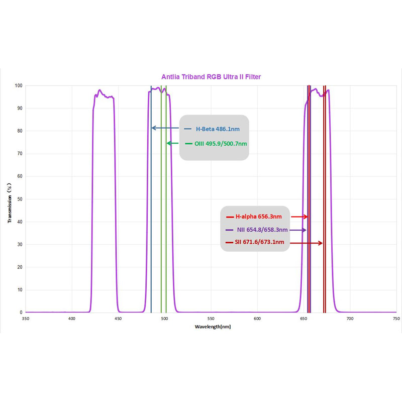 Filtret är utformat för effektiv minskning av ljusföroreningar vid användning av både OSC- och monokameror. Antlia Triband RGB Ultra-filtret gör det möjligt att fånga mer än 90 % av alla djupskyobjekt. Förutom sin höga effektivitet på emissionsnebulosor kan filtret - till skillnad från många andra ultrasmalbandiga filter - också användas för att fotografera galaxer, reflektionsnebulosor och stjärnhopar under himmelkvaliteter från Bortle 8 ner till Bortle 1. Samtidigt levererar det mer naturliga och balanserade RGB-färger i de färdiga bilderna. Filtret har också ett brett bandpass, vilket är optimerat för snabba optiska system ner till f/2.