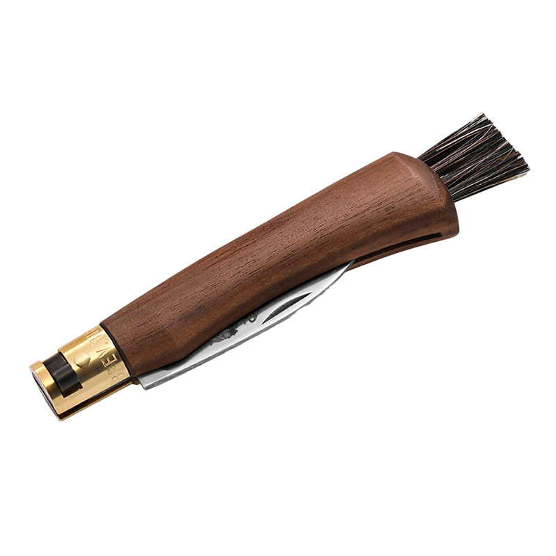 Svampknivens skaft är tillverkat av amerikanskt valnötsträ, medan bladet är av stenslipat, rostfritt stål. Öppna och stäng kniven manuellt. Knivens bladlåsningssystem har en rejäl säkerhetsring så att handtaget förblir öppet eller stängt.