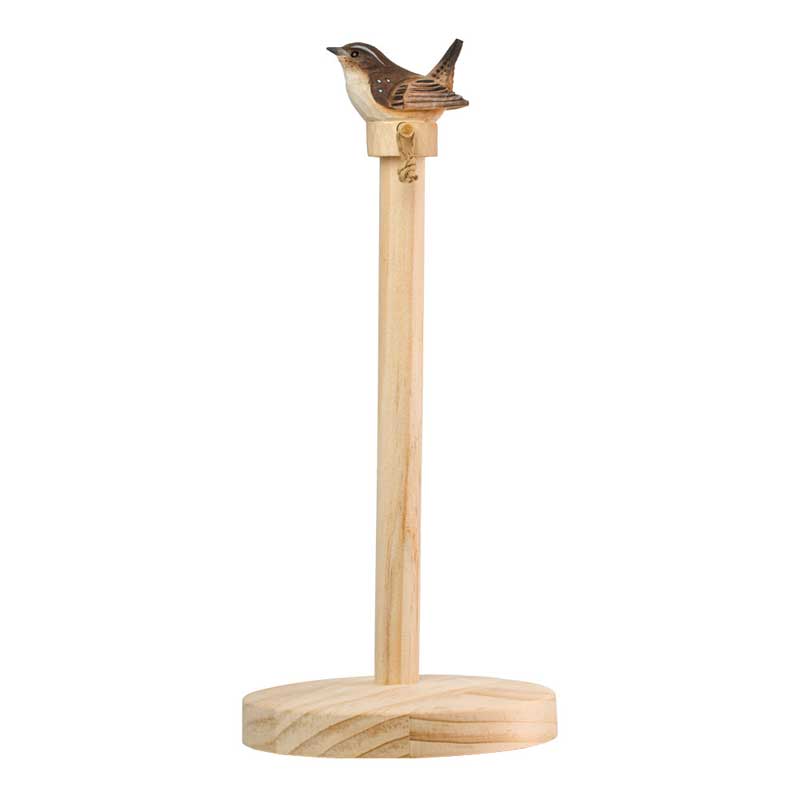 En handskuren gärdsmyg pryder toppen av den gedigna köksrullehållaren.